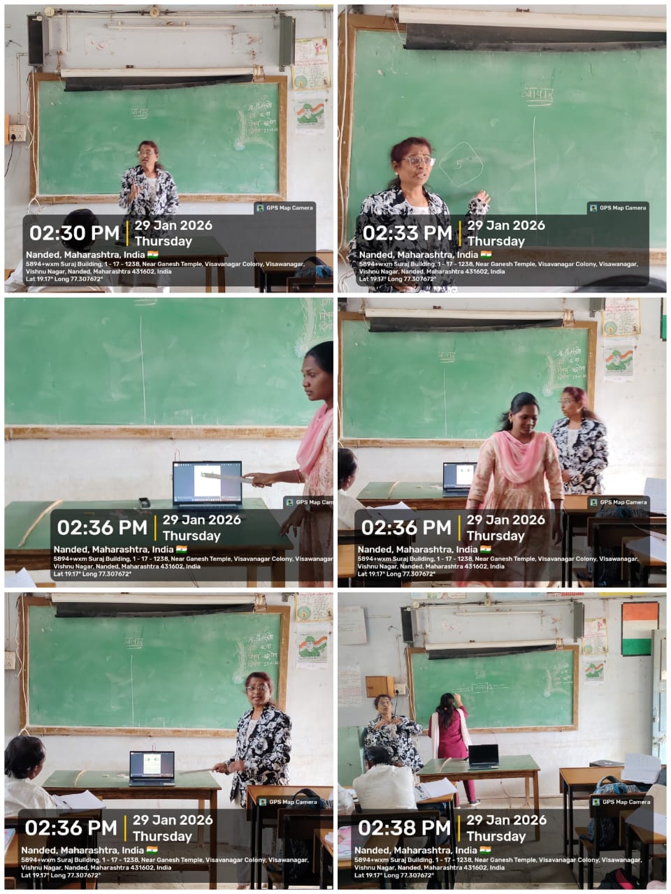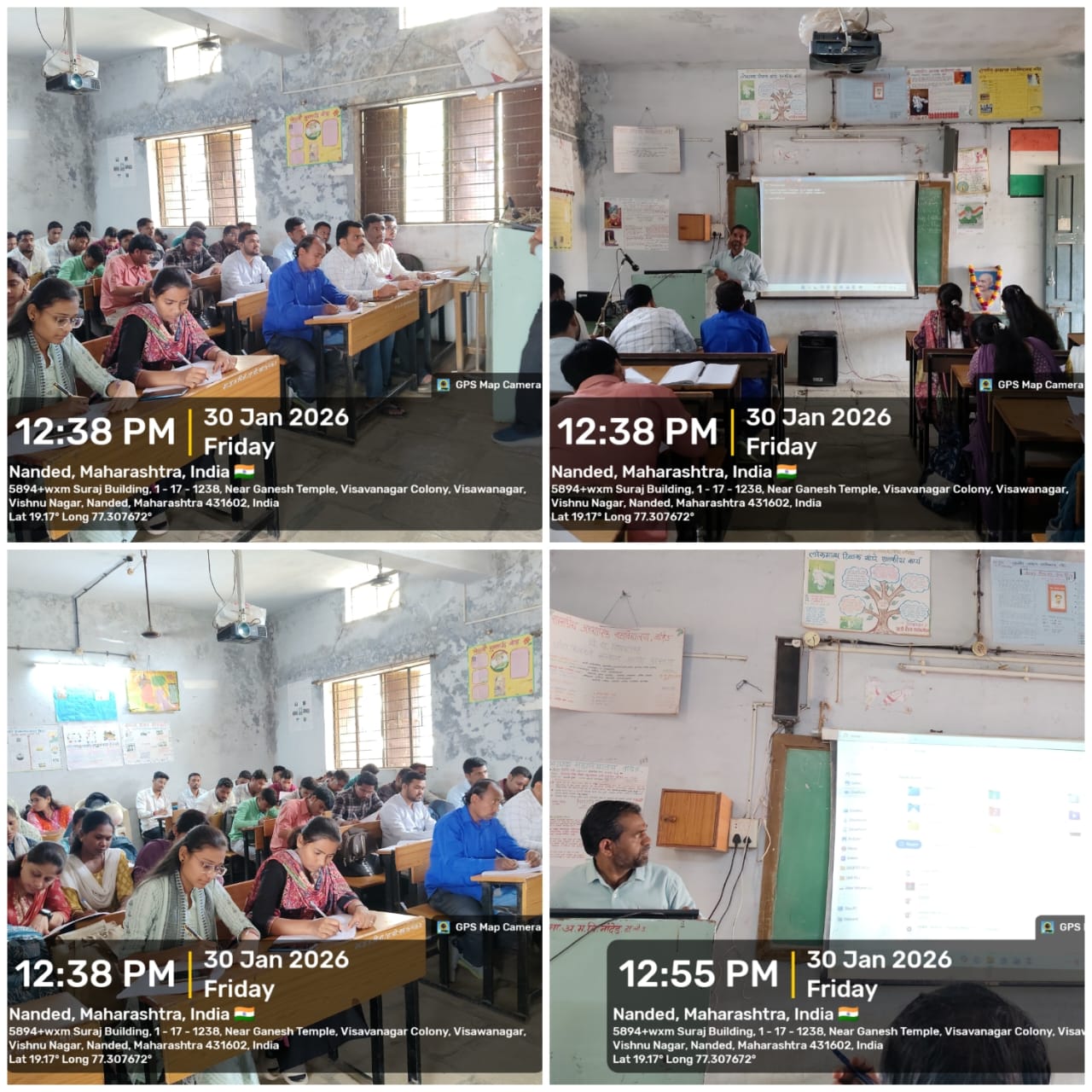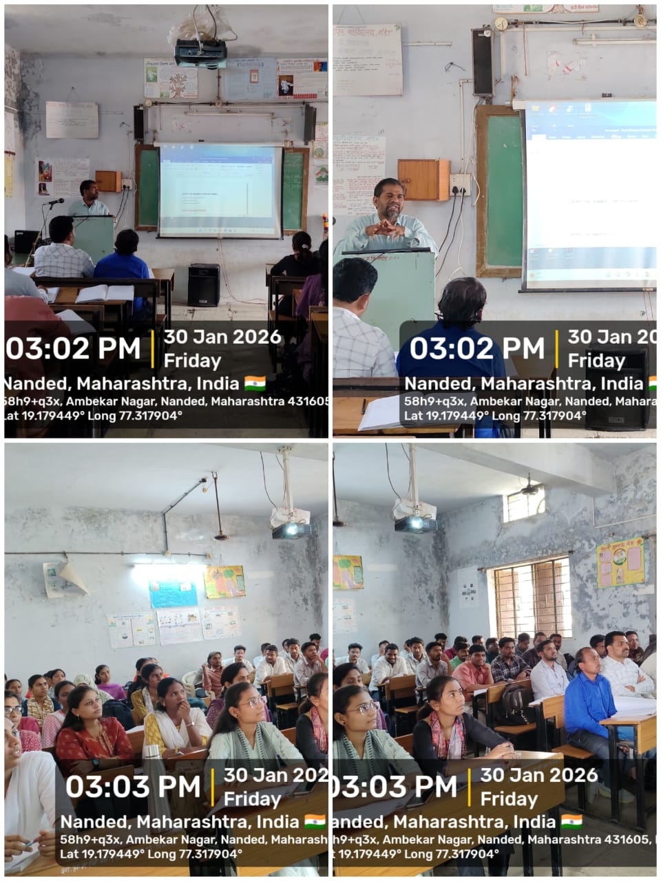 दिनांक 30 व 31 जानेवारी 2026 रोजी अध्ययन - अध्यापन प्रक्रियेत ICT चा वापर या प्रात्यक्षिक कार्यावर तज्ञ निमंत्रित श्री एम एस भडके यांनी प्रशिक्षणार्थ्यांना मार्गदर्शन केले व प्रत्यक्ष प्रात्यक्षिक कार्याचा सराव घेण्यात आला.महाविद्यालयाच्या प्राचार्य डॉ उर्मिला धूत व विभाग प्रमुख डॉ घोंशेटवाड यांनी निरीक्षण केले ( Two days workshop has taken on practical work use of ICT in teaching-learning process & also practice on this practical work has taken on dated 30 & 31 January 2026 by guest expert Shree MS Bhade.Work shop has observed by College Principal Dr Urmila Dhoot & head of the department Dr Vitthal Ghonshetwad)