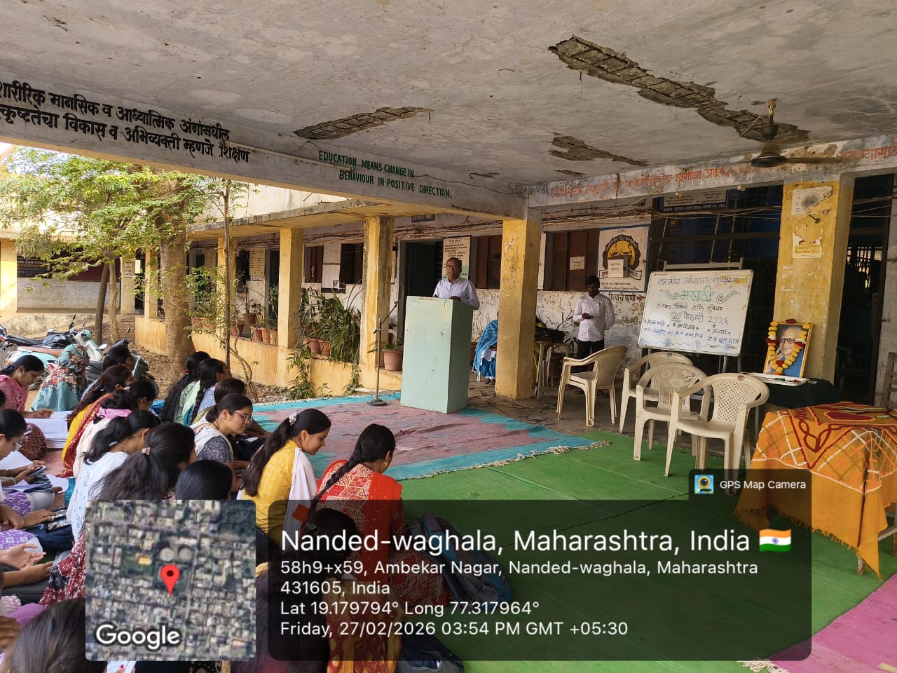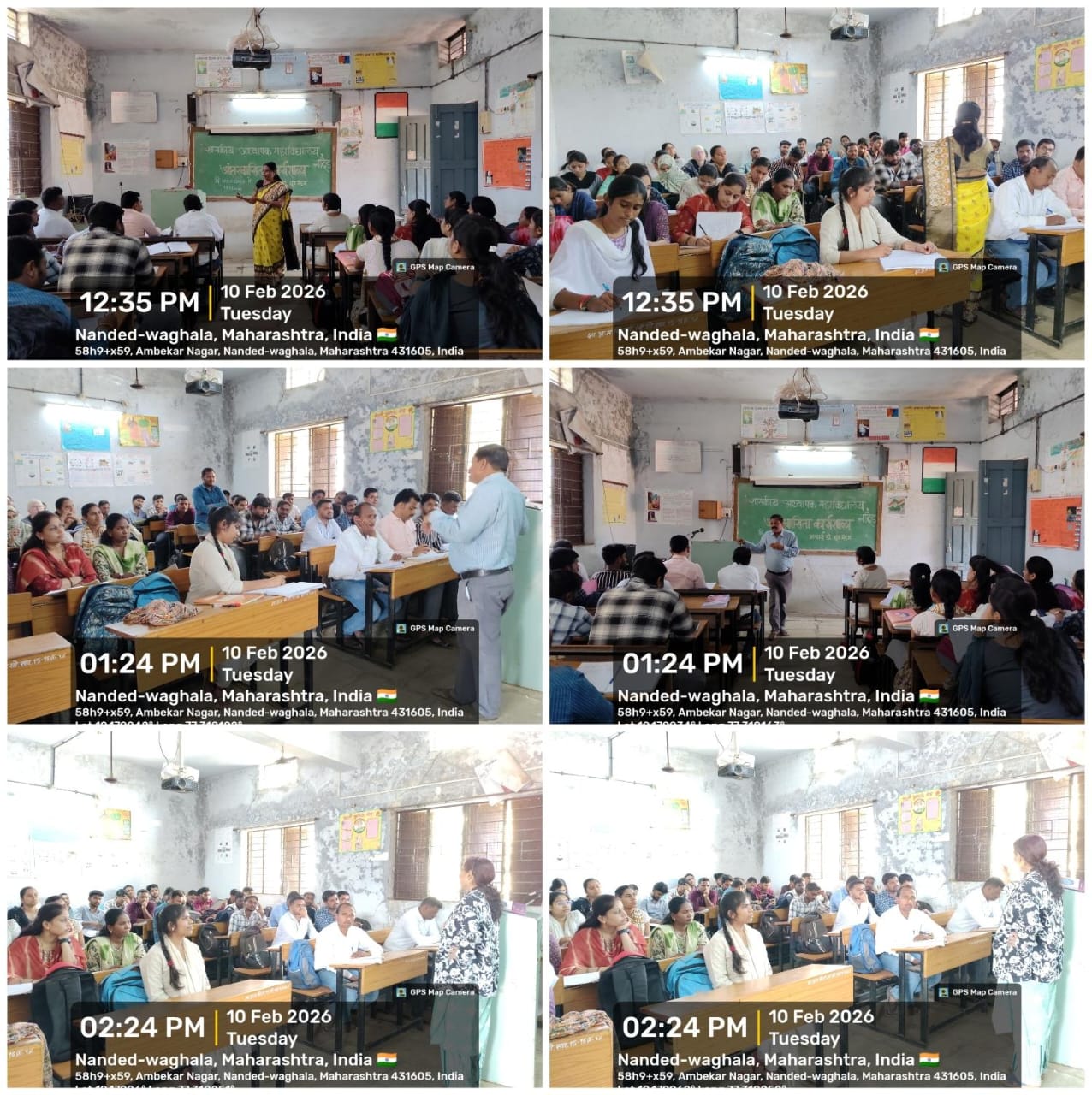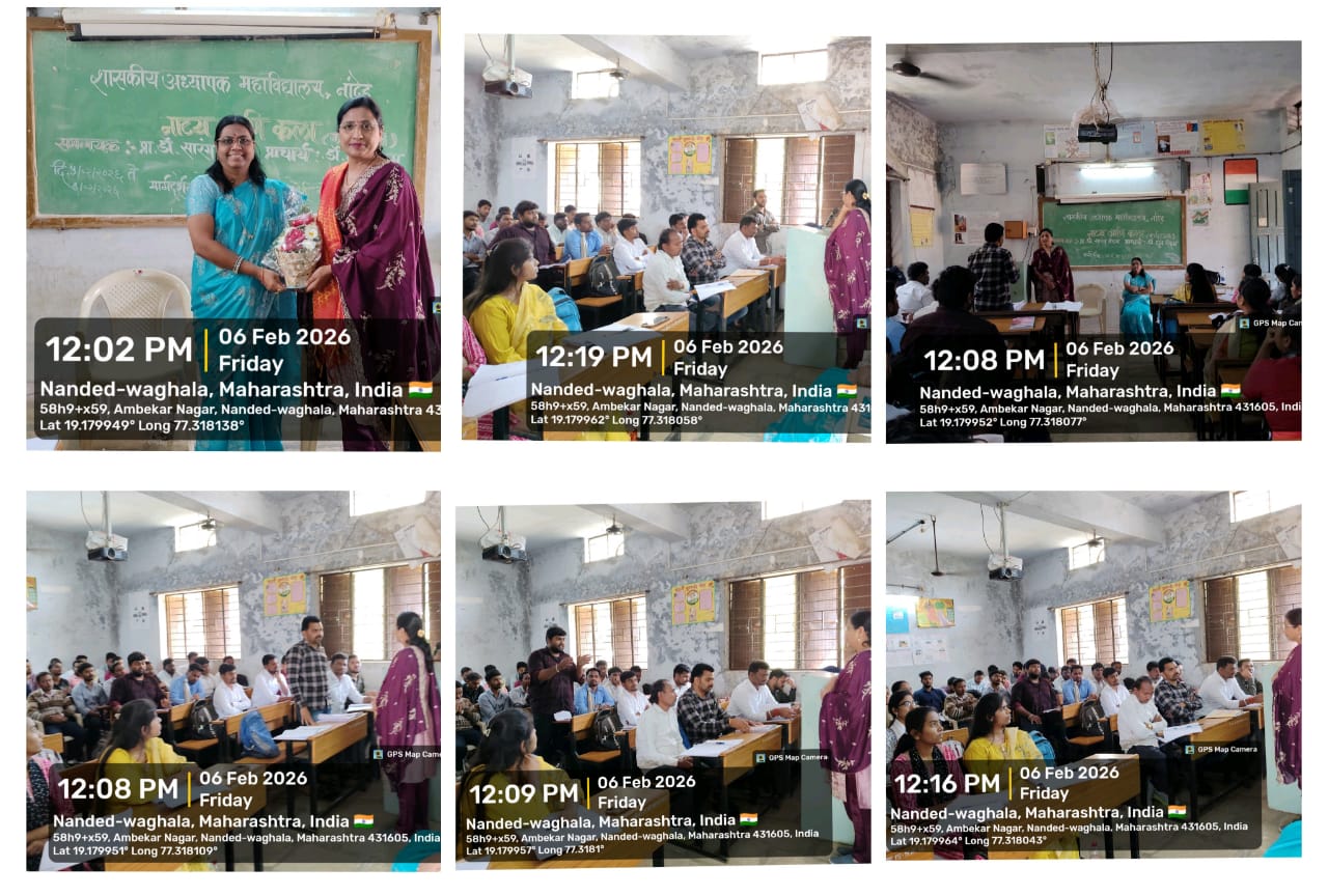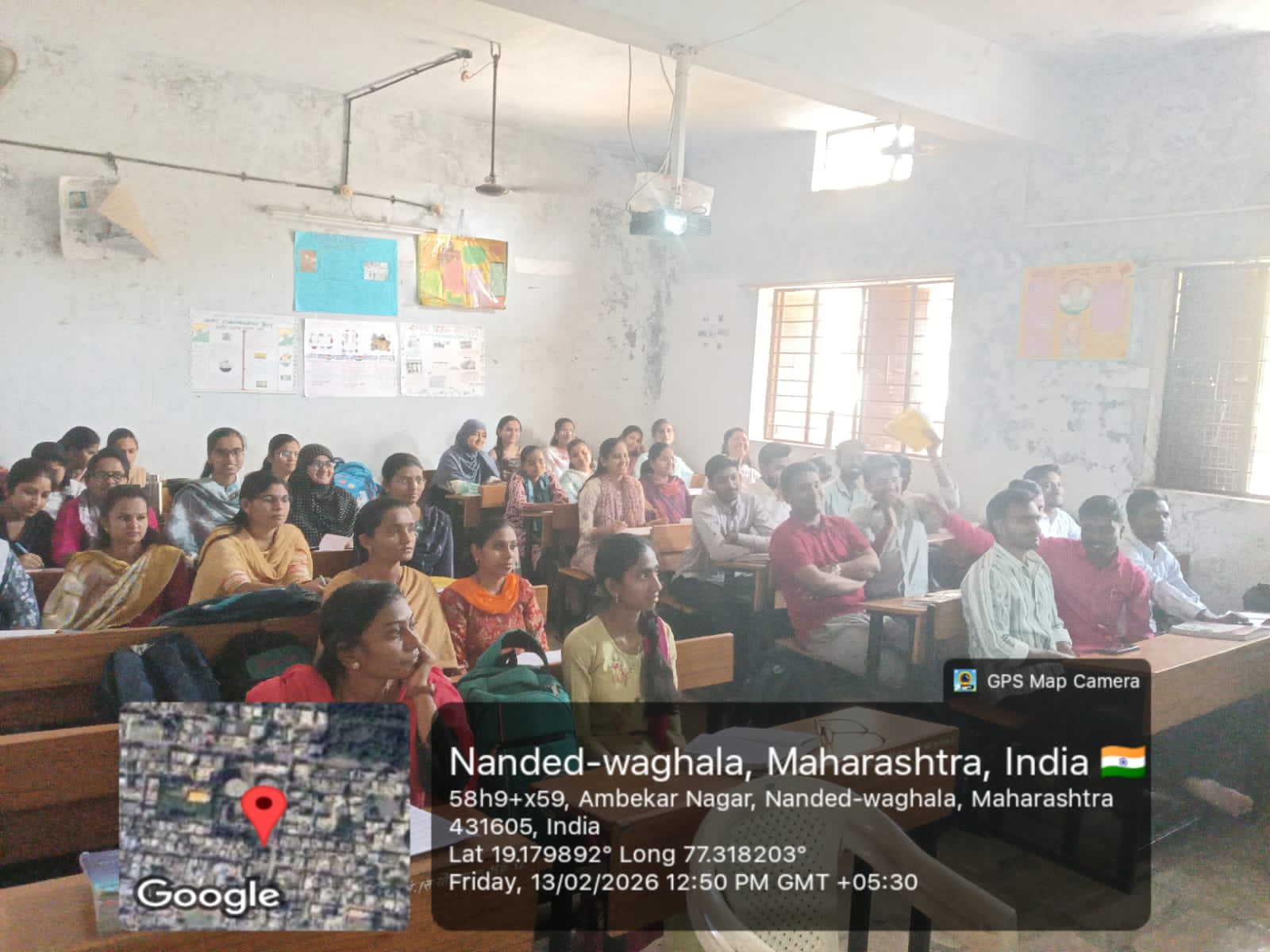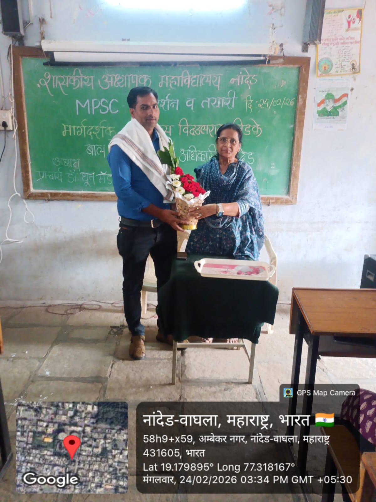 आज दिनांक 24 फेब्रुवारी 2026 रोजी महाविद्यालयात. एम पी एस सी. परीक्षा व तयारी या विषयावर एका दिवसाची कार्यशाळा घेण्यात आली.श्री कैलास विठ्ठल तिडके,जिल्हा बाळ विकास प्रकल्प अधिकारी,नांदेड यांनी द्वितीय वर्षाच्या प्रशिक्षणार्थ्यांना एम पी एस सी(MPSC) परीक्षा व तयारी या बाबत चे मार्गदर्शन केले .या वेळी महाविद्यालयाच्या प्राचार्य डॉ उर्मिला धूत यांनी प्रशिक्षणार्थ्यांनी स्पर्धा परीक्षांचा अभ्यास करावा या बाबत उदबोधन केले ( one day work shop for 2nd year teacher trainee has organised on MPSC exams & preparation . Dist Bal Vikas project offer Nanded Shree Kailash Vitthalrao Tudke has guided to teachertrainee .College principal Dr Urmila Dhoot oriented to teacher trainee about awareness of MPSC exam on dated 24 February 2026)