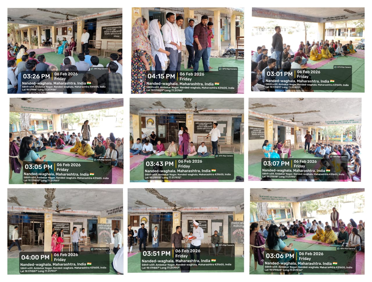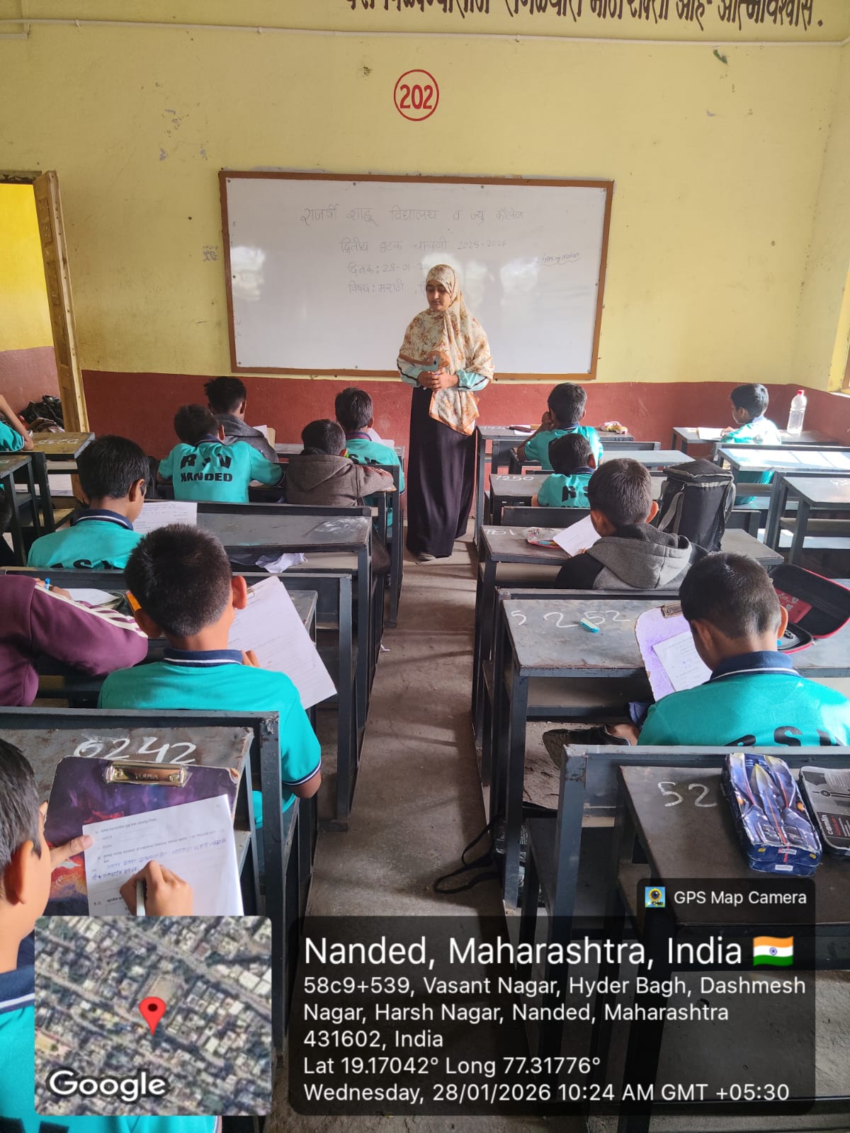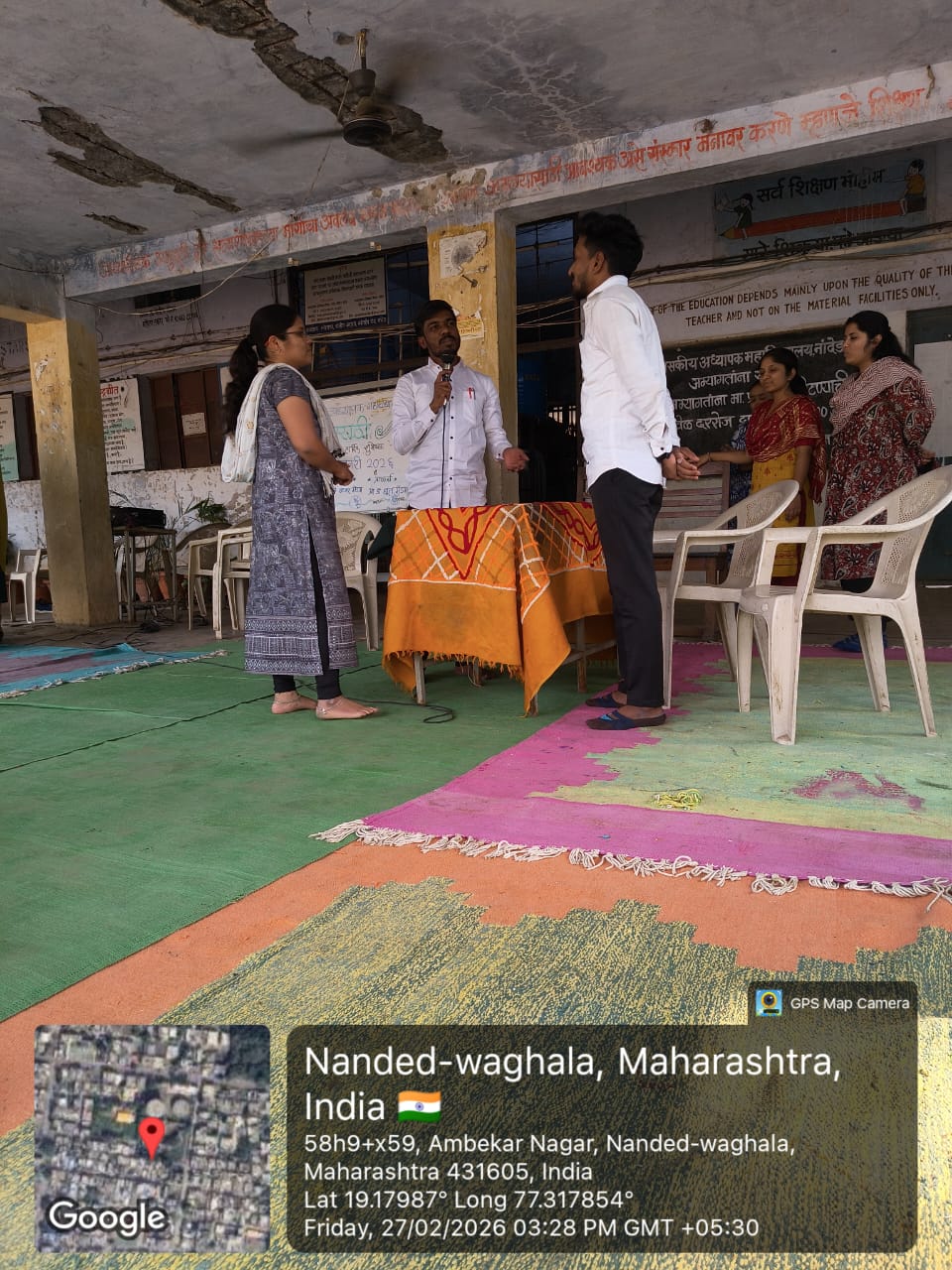 दिनांक 29 नोव्हेंबर 2025 ते दिनांक 28 फेब्रुवारी 2026 पर्यंत बीएड द्वितीय वर्ष चतुर्थ सत्रासाठी अंतर्वासिता (छात्रसेवाकाल )कार्यक्रम राजर्षी शाहू माध्यमिक विद्यालय ,वसंत नगर नांदेड येते सकाळ व दुपारच्या सत्रात लावण्यात आले .दिनांक 10 डीसेंबर 2025 पर्यंत प्रशिक्षणार्थ्यांनी राजर्षी शाहू माध्यमिक विद्यालय ,वसंत नगर, नांदेड येथे विविध कार्यक्रम घेतले यात -अध्ययन -अध्यापन ,क्रीडा स्पर्धा ,आरोग्य तपासणी ,संविधान दिन जागृती , संविधान शपथ ,कार्यानुभव ,मानवी हक्क दिन कायदा जाणीव जागृती इत्यादी उपक्रम प्रशिक्षणार्थ्यांनी शाळेत घेतले ( Internship program has arranged at Rajrshi Shahu Secondary School,Vasant Nagar,Nanded in two sessions from 29 November 2025 to 28 February 2026 .During this Internship programme up to 10 December 2025 ,Teacher trainee has taken various programmes ,such as - Teaching-Learning,Sports, Health check up , awareness about Constitutional day,Taking constitutional oath, work experience, Human Rights day &awareness )