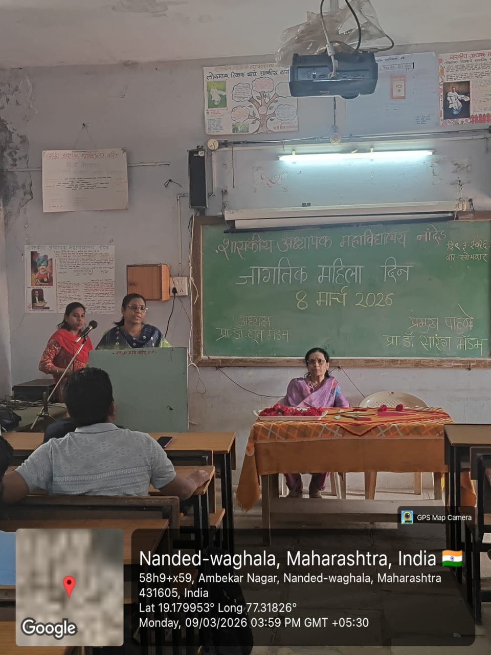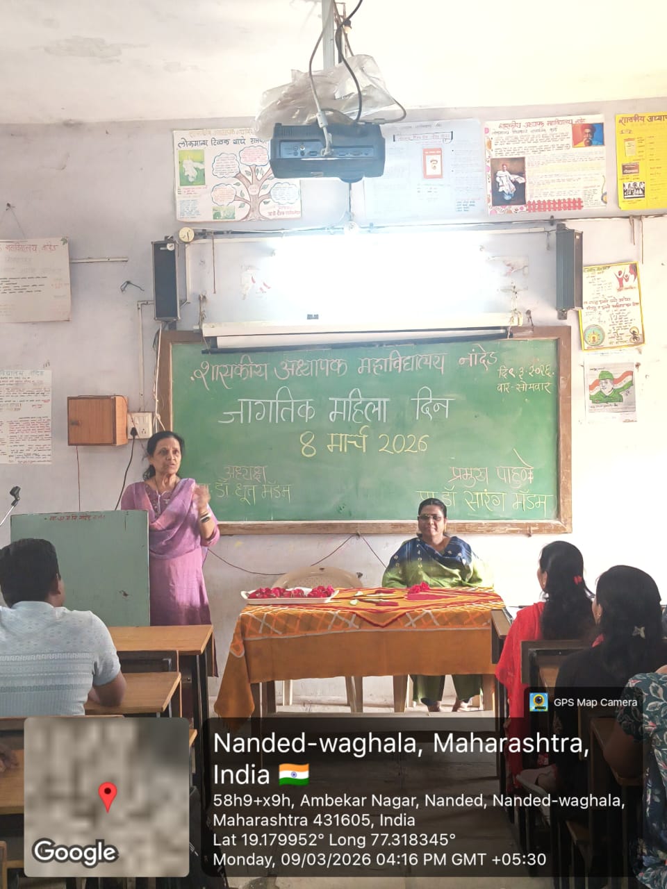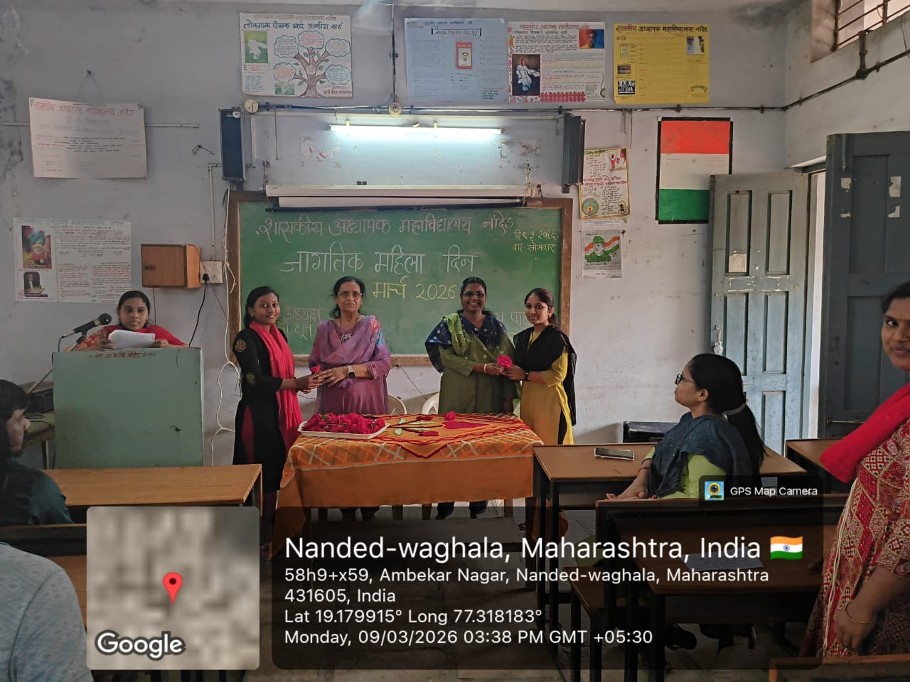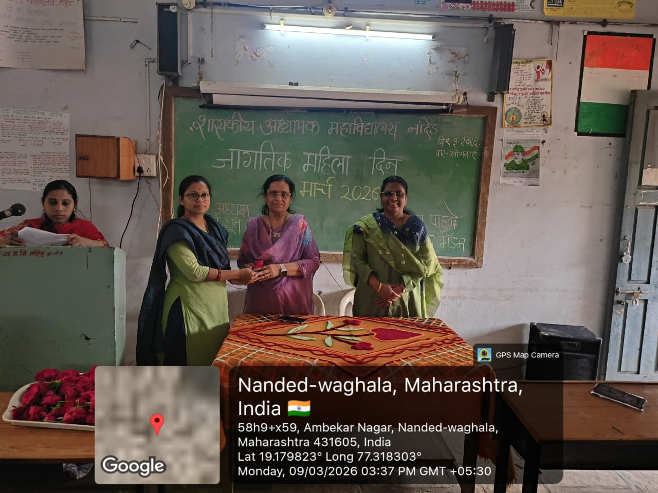 आज दिनांक 09 मार्च 2026 रोजी महिला दिन साजरा करण्यात आले.या प्रसंगी महाविद्यालयाच्या प्राचार्य मा.डॉ उर्मिला धूत व प्रा. शैला सारंग यांनी सर्व महिला प्रशिक्षणार्थ्यांचे व महिला कर्मचाऱ्यांचे पुष्प देऊन स्वागत केले .महिला प्रशिक्षणार्थानी महिलांच्या विविध अडचणी ,विकास ,समाजातील स्थान व महत्व इत्यादी बाबीवर विचार व्यक्त केले.प्रा.डॉ सारंग यांनी महिला व तिची जवाबदारी व येणाऱ्या अडचणी या विषयावर मार्गदर्शन केले तर प्राचार्य मा. डॉ उर्मिला धूत यांनी सर्व कार्यक्रमाचा आढावा घेतला व महिला चे देश,समाज,व कुटुंबातील स्थान व महत्व ,येणाऱ्या अडचणी यावर मार्गदर्शन करून अध्यक्षीय समारोप केला ( Mahila day has celebrated with various activities on dated 09 march 2026)