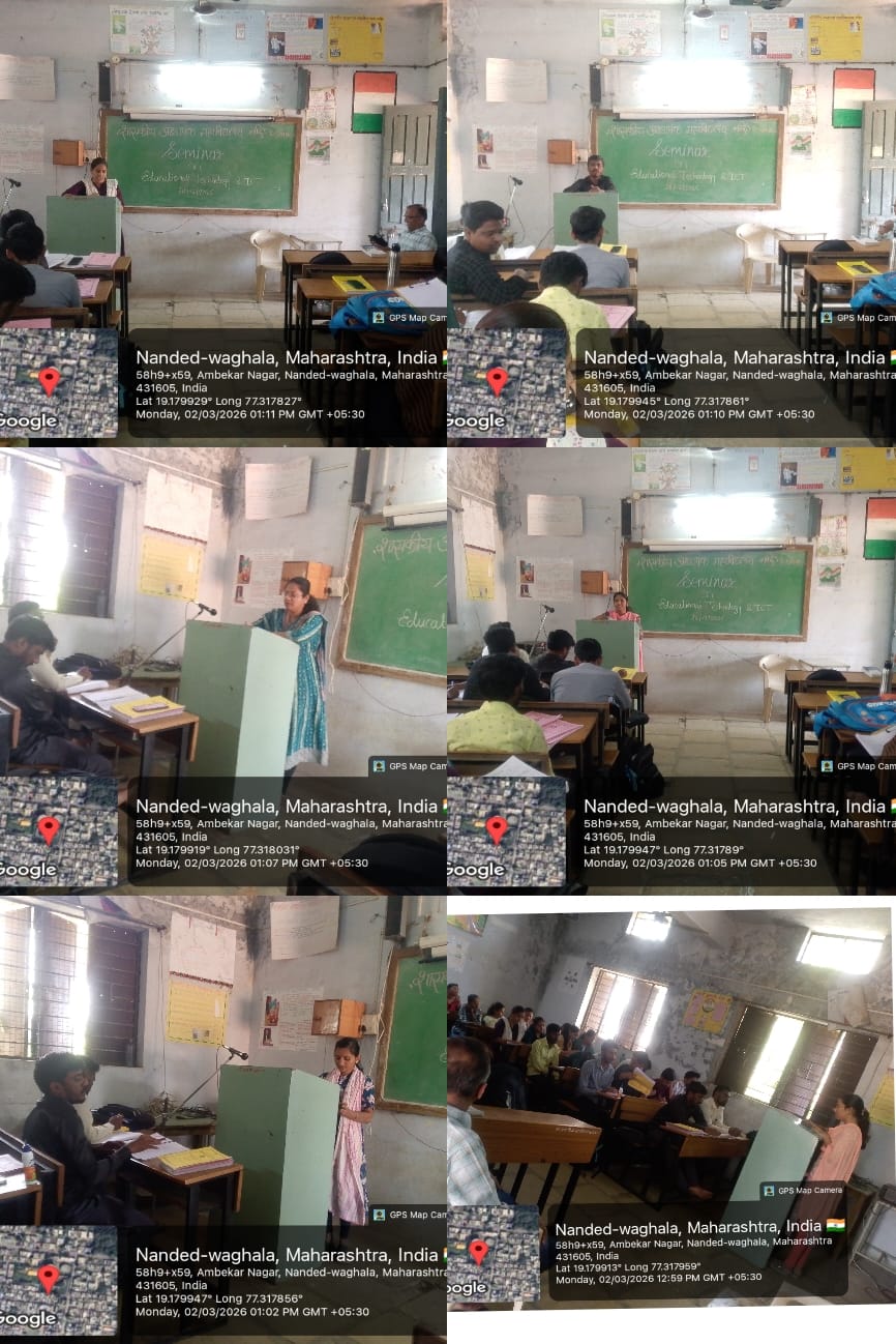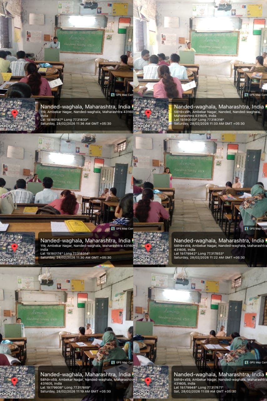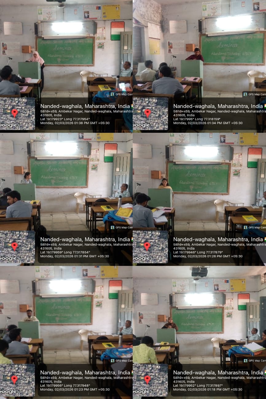 आज दिनांक 28 फेब्रुवारी व 2 मार्च 2026 रोजी शैक्षणिक तंत्र विज्ञान या विषयावर द्वितीय वर्षाच्या 4 th सत्राच्या प्रशिक्षणार्थ्यांचे सेनीनार विभाग प्रमुख डॉ गोविंद भुसारे यांच्या मार्गदर्शनाखाली घेण्यात आले (Second year 4th semester teacher trainee has given seminar on ICT subject under guidance of Dr Govind Bhusare on dated 28 February & 3 march 2026 )