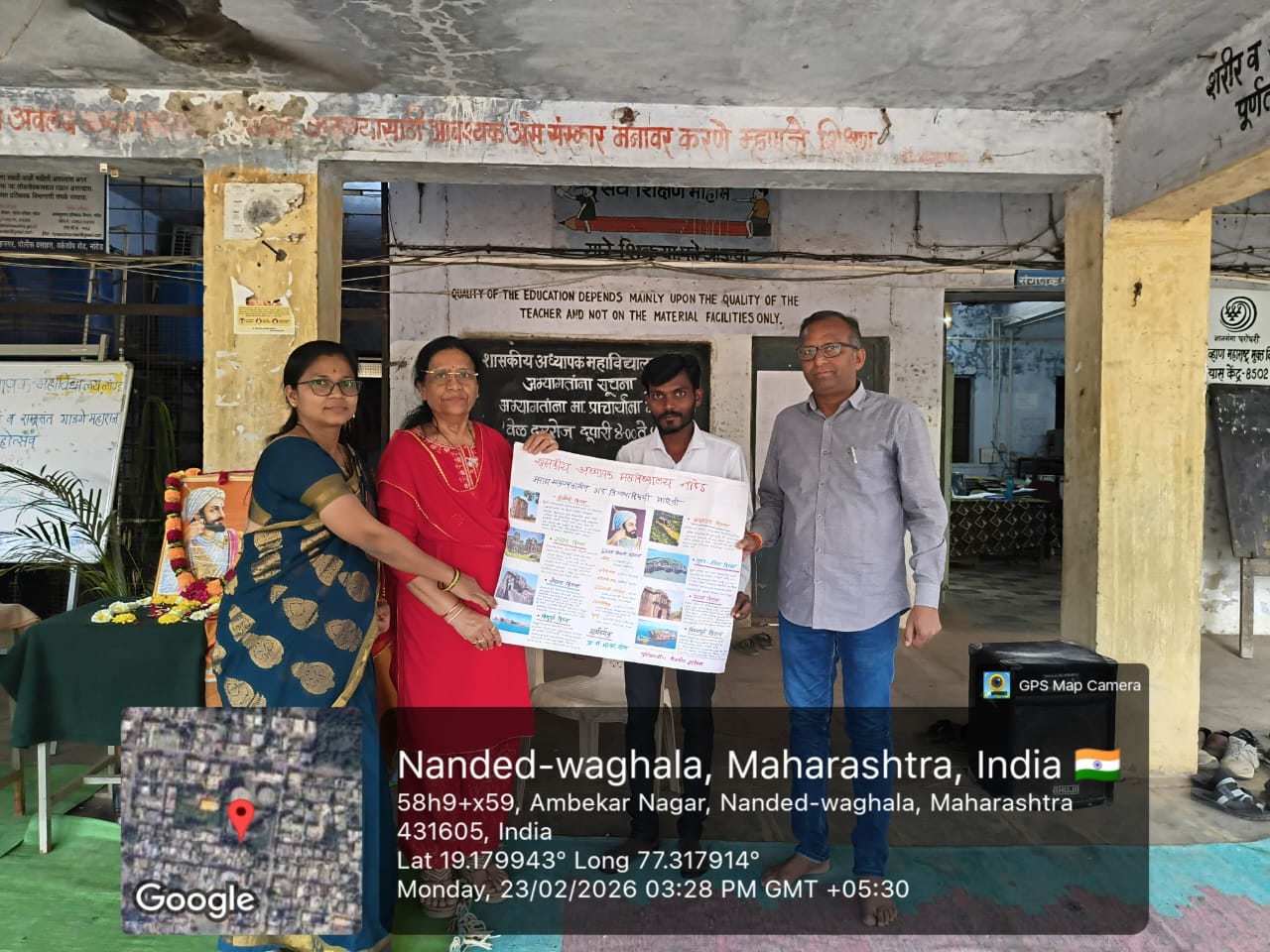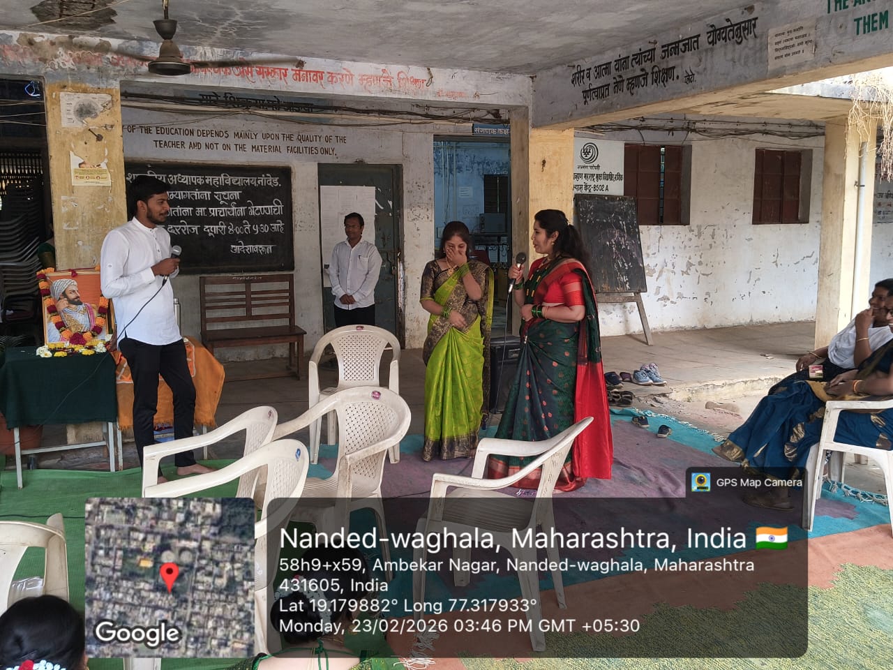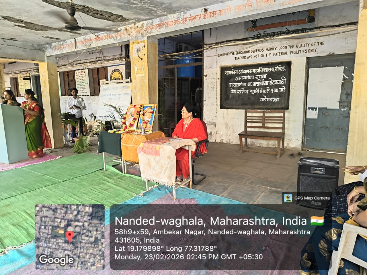 आज दिनांक 23 फेब्रुवारी 2026 रोजी संत गाडेबाबा व छत्रपती शिवाजी महाराज यांची जयंती प्रतिमापूजन करून करण्यात आली.या प्रसंगी प्रशिक्षणार्थ्यांनी शिवाजी महाराज यांच्या जीवन कार्यवर अनेक विविध बाबी सादर केल्या यात भाषण कवितापोवाडा ,शेरशायरी ,नाटिका,भित्तीपत्रके,गीत,प्रश्न मंजुषा इत्यादी कृतीतून प्रशिक्षणार्थ्यांनी शिवाजी महाराजांचे विविध कार्य सादर केले.कार्यक्रमाच्या शेवटी महाविद्यालयाच्या प्राचार्य डॉ उर्मिला धूत यांनी संत गाडगे बाबा व छत्रपती शिवाजी महाराज यांचे जीवन कार्य आजच्या परिस्थिती कसे मार्गदर्शक आहे यावर मार्गदर्शन केले ( birth anniversary of Sant Gadge Baba &Chatrapati Shivaji Maharaja has celebrated by Idol worship,on this occasion teacher trainee performed various activities on Chatrapati Shivaji Maharaj life work such as-speech ,ballad,couplets,act ,wallpapers,Geet ,quiz ,etc.chair person pri.Dr Urmila Dhoot has guided to the teacher trainee on life work of sant Gadge Baba &Chatrapati Shivaji Maharaj on dated 23 February 2026)