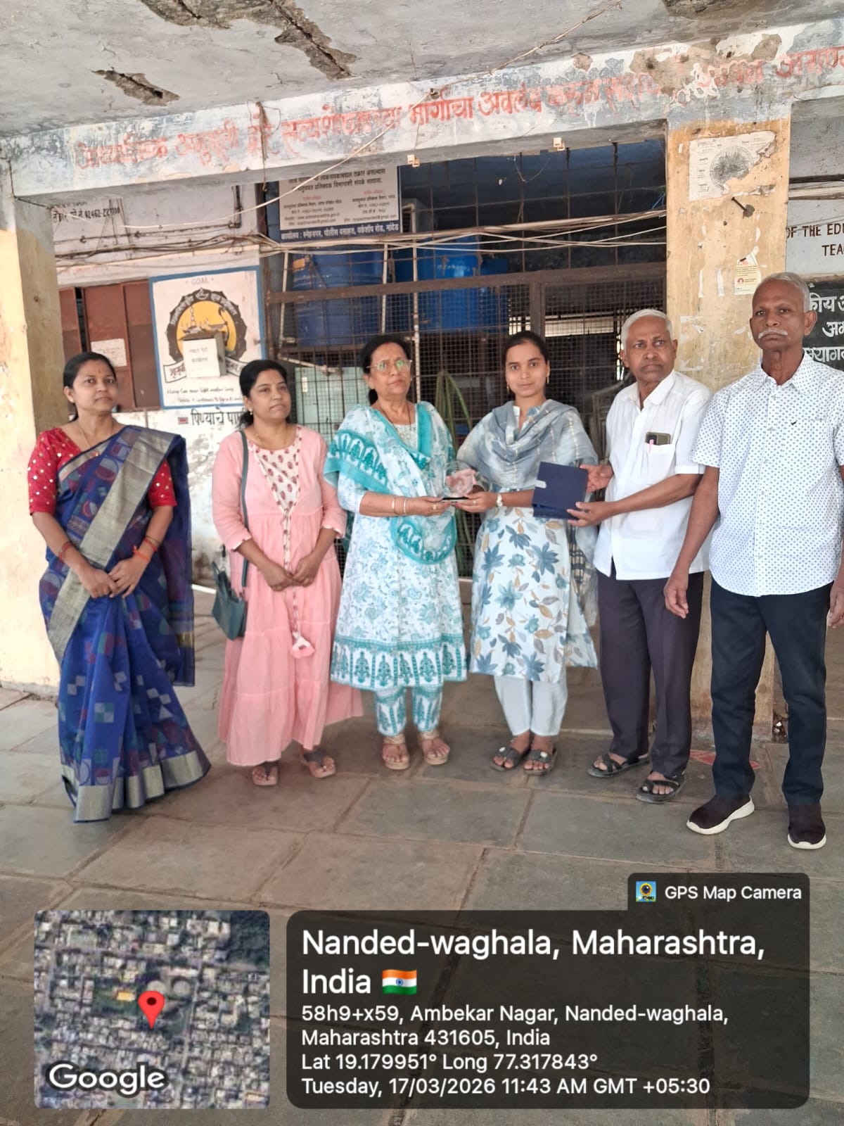 आज दिनांक 17 मार्च 2026 रोजी हार्टफुल नेस सहज ध्यान धारणा या केंद्रा मार्फत घेण्यात आलेल्या राज्यस्तरीय स्पर्धेत महाविद्यालयातील द्वितीय वर्षातील प्रशिक्षणारथीं कु स्नेहा सातपुते यांचा प्रथम क्रमांक आल्याबद्धल बक्षिस देतांना महाविद्यालयाच्या प्राचार्य डॉ उर्मिला धूत व हार्ट फुल नेस च्या सिस्टर प्रमिला,ब्रदर व प्रशिक्षणार्थी ( Award has received by second year teacher trainee Sneha Satpute given by the Heart full ness on winning the state competition organised by heart full ness on dated 17 march 2026 )