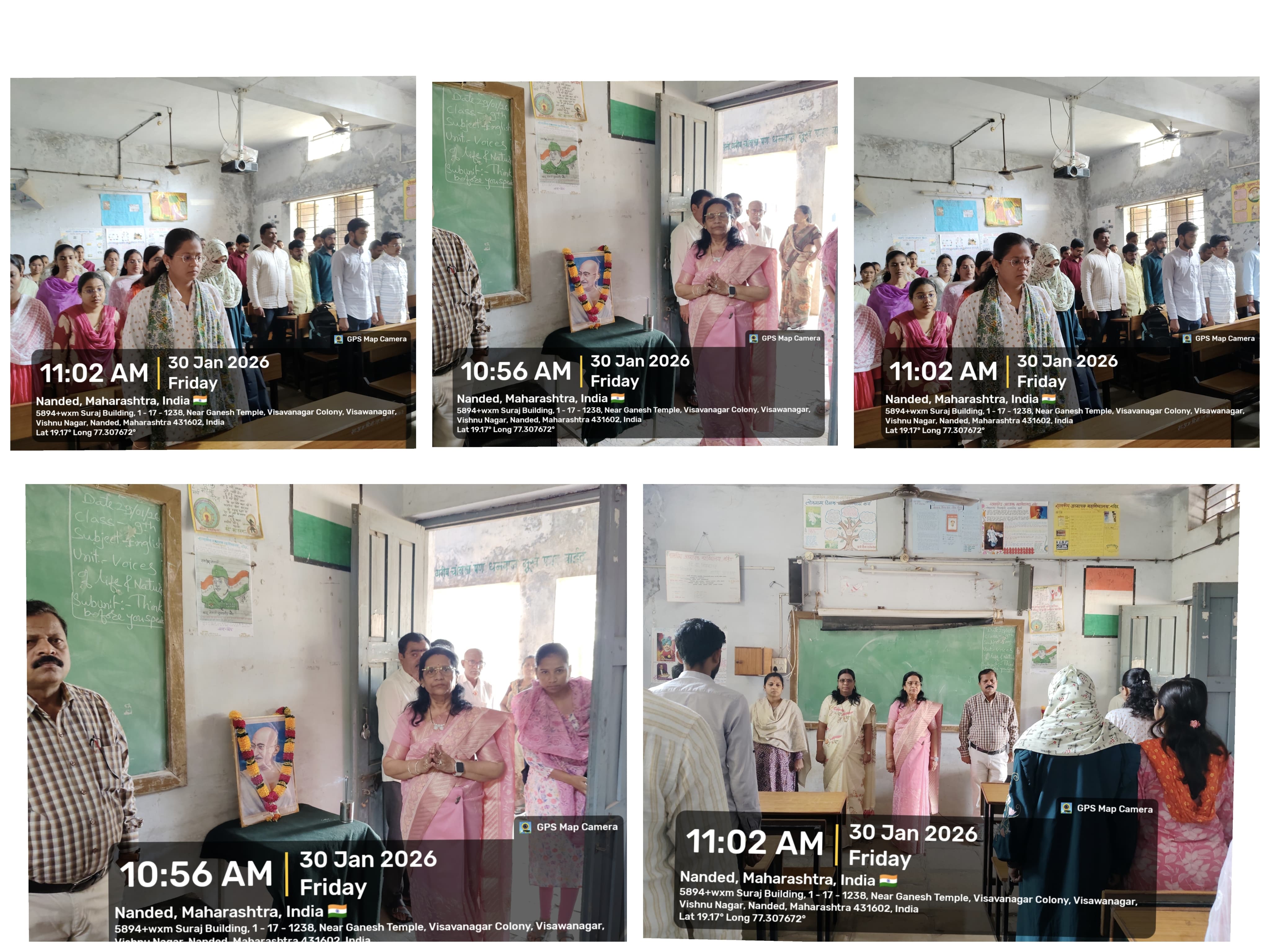 आज दिनांक 30 जानेवारी 2026 रोजी सकाळी 11.00 वाजता दोन मिनिटे मौन ठेऊन हुतात्मा दिन पाळण्यात आला.या प्रसंगी 10.55 वाजता महाविद्यालयाच्या प्राचार्य डॉ उर्मिला धूत यांनी महात्मा गांधी यांच्या प्रतिमेचे पूजन करून वंदन करण्यात आले . या प्रसंगी महाविद्यालायाचे प्राचार्य ,सर्व प्राध्यापक , शिक्षकेत्तर कर्मचारी व सर्व प्रशिक्षणार्थी उपस्थित होते(Observing two minutes silence on 11.00 AM on Martyrs’Day /Shaheed Diwas on dated 30 January 2026.On 10.55 AM College Principal Dr Urmila Dhoot has worshiped Mahatma Gandhi Idol )